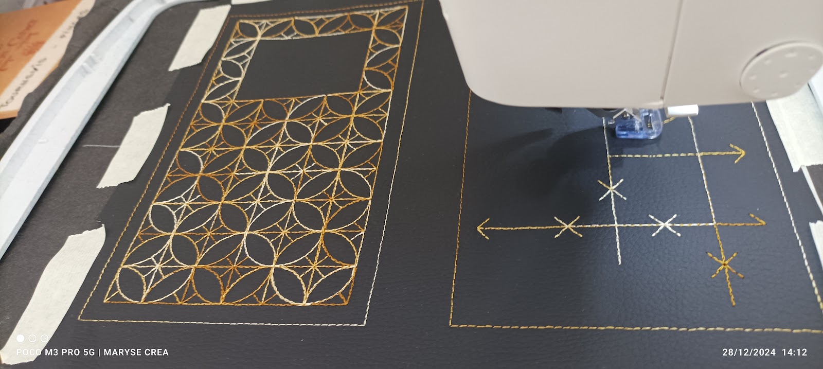 – La première étape consiste à broder un fond sur un simili cuir souple. Ce matériau est choisi pour sa flexibilité et son aspect esthétique.